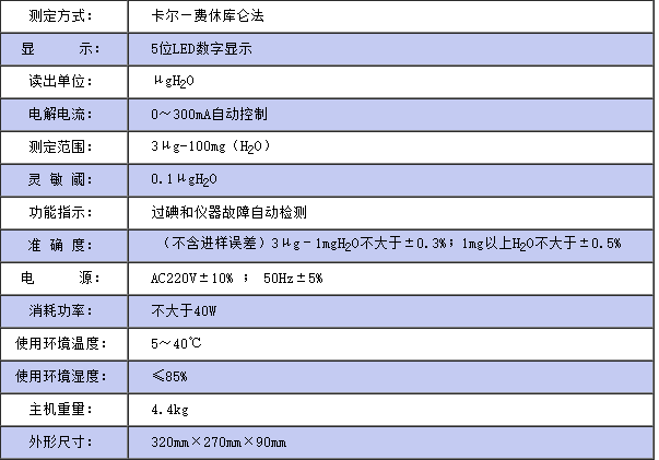 儀器符合GB/T7600;SH/T0246;GB/T606及采用卡爾—費休法測定樣品中水分的有關(guān)標(biāo)準(zhǔn)。儀器采用了先進(jìn)的自動控制電路,電解電流自動跟蹤控制,外型結(jié)構(gòu)新穎,增加了過碘指示和儀器故障自動檢測功能,從而使該儀器工作更可靠,使用更方便, 具有分析速度快(一分鐘出結(jié)果)、操作簡便、精度高、自動性強(qiáng)等特點,廣泛應(yīng)用于石油、化工、電力、鐵路、環(huán)保等部門。